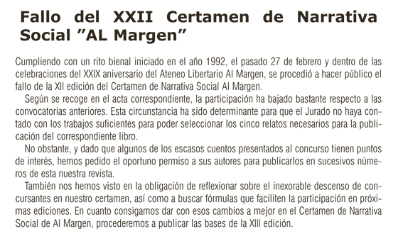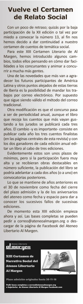 Como en ediciones anteriores, y al objeto de que puedan ser publicadas y conocidas las obras de quienes, teniendo cosas que escribir y valiendo la pena ser leídas, no cuentan con medios o prefieren las editoriales alternativas, el Ateneo Libertario Al Margen convoca este “X CERTAMEN DE CUENTOS ” (Narrativa breve), con las siguientes bases: