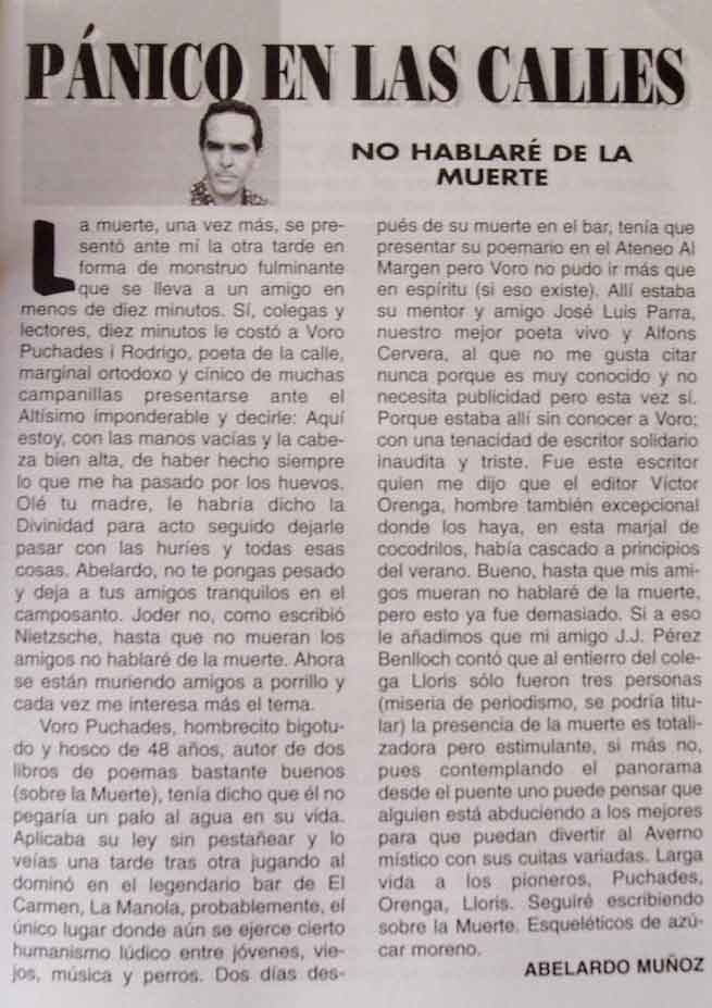 Voro Puchades i Rodrigo poeta mercurial de verso destilado, a ratos, cuando no, poesía vertida en prosa torrencial. Megalómano callejero sin púlpito, obligado a cazar incauto público. Tahúr anárquico que se juega las horas de vida con la muerte mientras pasea la lengua por su bigote impregnado en coñac. Inquilino de tabernas y tugurios con reserva en un rincón de la barra desde donde con mirada diamantina escruta las almas de los aburridos, los insomnes, los perdidos, los sedientos, las damas de glorias pasadas y las candidatas a princesas disfrazadas de punkis.