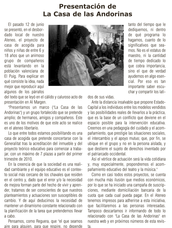 Després de les exposicions dels quatre integrants de la taula i de les intervencions del públic on es va donar regna solta a la capacitat creativa que ens fa humans, es va celebrar una vetlada reivindicocreativa en l’Ateneu Llibertari «Al Margen».