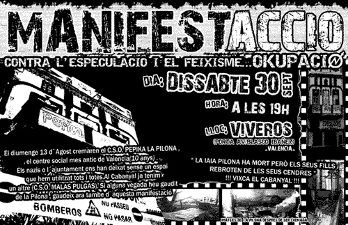 El domingo 13 de Agosto quemaron el CSO Pepika La Pilona, el centro social mas antiguo de Valencia (10 años). Los nazis o el Ayuntamiento nos han dejado sin un espacio que hemos utilizado todos y todas. En el Cabanyal ya tenemos otro (CSO Malas Pulgas). Si alguna vez has disfrutado de la Pilona, disfruta ahora tambien de esta manifestacion.