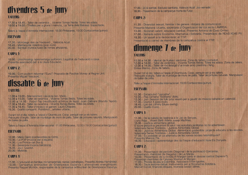 Divendres 18 desembre: 18h30: Trobada-debat “La València en lluita. Ací i ara”. Joventuts Llibertàries, Iniciativa La Dàhlia, Coop. L’Aixada com Eixida, CNT-València, Ateneu Llibertari “Al Margen”, Ràdio Klara, Dones i Prou, Ràdio Malva, Xarxa en Lluita, CSA Pangea, La Fusteria, REAS-PV i altres… Modera: José Asensio (Equip Comunicació CGT-PV).