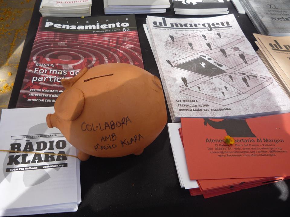 Carteles con un libro abierto dentro de una «A» en círculo convocaron en noviembre de 1998 a la primera edición de la Mostra del Llibre Anarquista de Valencia, la primera del estado español. La Mostra se ha consolidado desde sus lejanos inicios en el centro anarquista de la calle en Borràs (en la zona histórica de Valencia), y este año cumple su quince aniversario con presentaciones de libros, debates, talleres, conciertos, teatros y comidas populares veganas entre los días 18 y 26 de abril. Los dos últimos días (fin de semana del 25 y 26 de abril) las distribuidoras alternativas expondrán y pondrán a la venta sus materiales (libros, revistas, camisetas, CD…) en los puestos de la Plaza del Carmen (Más información en mostrallibreanarquista.com; mostradelllibreanarquista@gmail.com ).