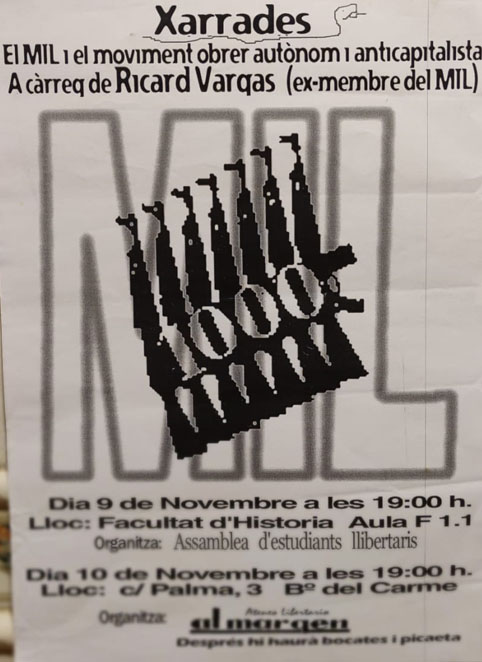 EL MIL (Movimiento Iberico de Liberación) y los grupos autónomos de Combate Ponente: Vargas Golarons. Esta charla tiene dos fechas: · NOVIEMBRE, 9, 19h, Aula F1.1 en la Facultad de Geografía e Historía · NOVIEMBRE, 10, 17 HS., Ateneu Al Margen, C/Palma, 3 [Junto a la plaza del Carmen]