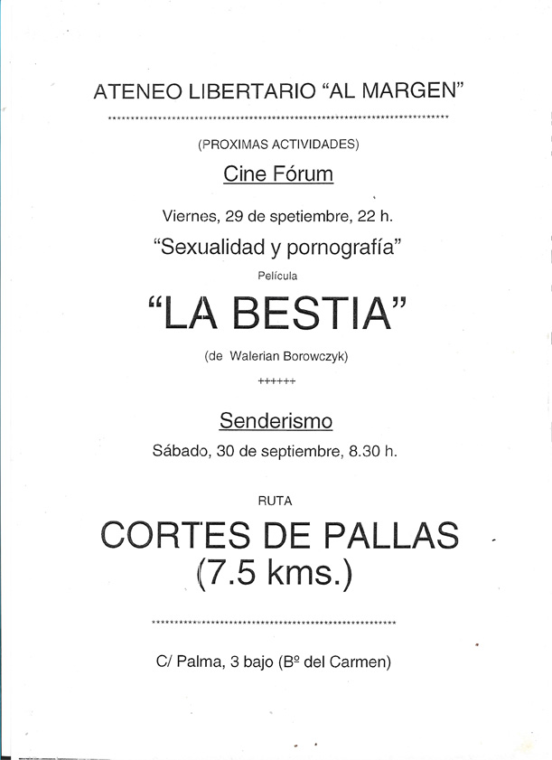 Y para finalizar unas sugerencias, que no directrices ni axiomas: los Ateneos Libertarios son los espacios físicos en los que se desenvuelven los grupos anarquistas que los componen, pero además es el lugar vital de la experiencia libertaria que irradia hacia el exterior su influencia en la medida de sus fuerzas. Nuestra pretensión, cuando tuvimos la genial idea de convocar a un primer encuentro de Ateneos Libertarios, era pulsar el nervio vital de nuestro movimiento, para tratar de ponemos de acuerdo en algunos puntos que a nosotros nos parecían cruciales. De ese encuentro salieron algunas iniciativas para tratar de posibilitar un contacto más fluido entre las diferentes experiencias que cada Ateneo desarrolla. Si al menos entre todos consiguiéramos poner las bases para lograr un deslinde de campos que permitiera que cada grupo, colectivo u organización anarquista actuara libremente en el área de su interés, sin que sobre sus cabezas pendiese a cada momento la pesada carga del anatema, habríamos hecho ya mucho en favor de nuestro movimiento.