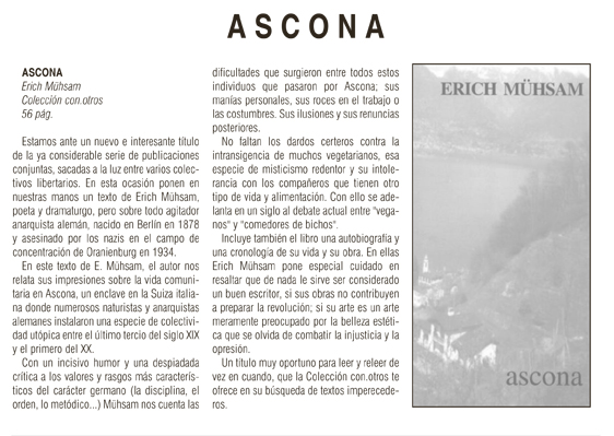 ASCONA es el relato que hace Erich Mühsam de este enclave junto al lago Maggiore donde se experimentaron, desde el último tercio del siglo XIX hasta los años 20 del siglo XX, otras formas de vida y donde se dieron cita todas las utopías. Mühsan llega a Ascona en compañía de su amigo Johannes Nohl, en 1905, y se instala en «Monte Verità», colonia ético-social-vegetariana-comunista, y describe aquel universo.